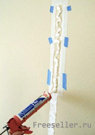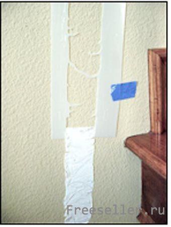 3) После того, как необходимая форма для дерева будет сложена, трафарет необходимо закрепить на стене по разметке с помочью ленты. Теперь будем делать дерево. Наберите из бадью в пистолет шпаклёвку. Осторожно наносите ту на стену как раз в центр трафарета, выдавливая её из пистолета, словно зубную пасту из шприца. Смотрите, не переборщите со шпаклёвкой, иначе она потом может осыпаться со стены. Затем возьмите шпатель и распределите им шпаклёвку, заодно придавая ей необходимую текстуру. Помните о том, что работать нужно в хорошо проветриваемом помещении, а иногда ещё и распылять хороший дезодорант или освежитель воздуха во время работы, чтобы минимизировать запах шпаклёвки.