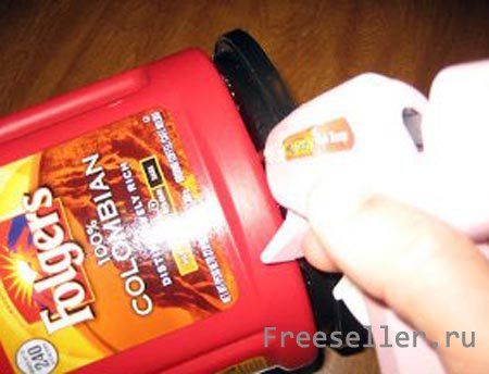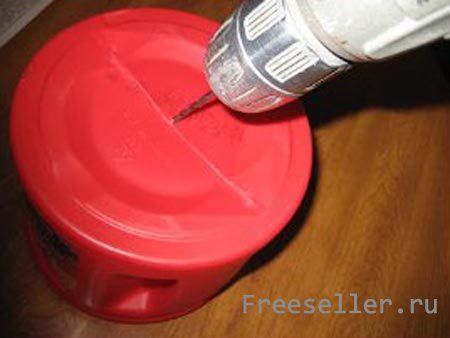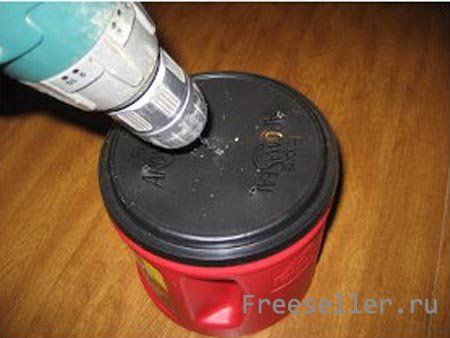 2) Возьмите банку из-под кофе и просверлите пять отверстий в её крышке, а потом ещё пять в дне. Именно поэтому я в начале писала, что лучше будет взять банку, которая полностью состоит из пластика - сверлить легче.
