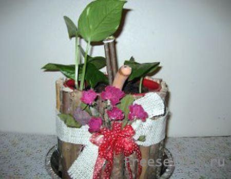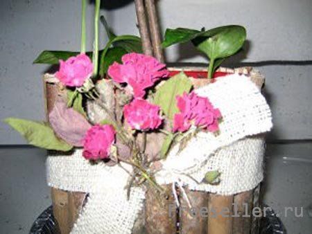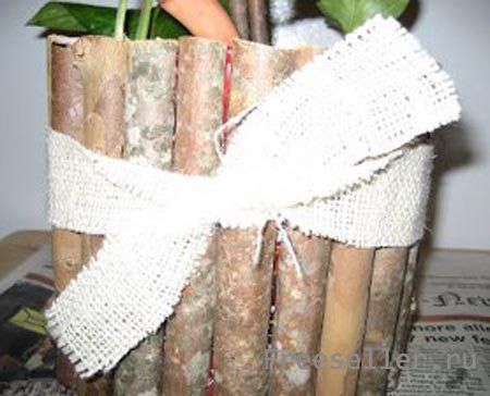 6) Возьмите грубую плетёную ткань и вырежьте из неё полоску шириной в пять сантиметров и длинною в 75-80 сантиметров. Приклейте её к палочкам, обмотав один раз вокруг будущего горшка, а после завяжите концы на узел или бант.