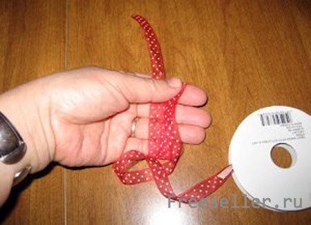 8) Возьмите достаточно длинную ленту, чтобы была возможность сделать три её оборота вокруг четырёх пальцев, как показано на рисунке ниже. Делайте это так, чтобы с двух сторон у вас осталось по одному длинному концу. После осторожно снимите ленту с пальцев, возьмите ещё кусочек ленты, оберните ею по середине те три оборота (круга) ленты и просто завяжите узел. Теперь расправьте ленту так, чтобы получился бантик.