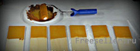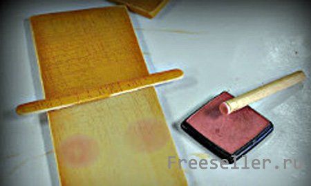 2) Подготовьте небольшую плоскую палочку с округлыми концами - покрасьте её в цвет античного золота, там, где заканчивается окрашенная часть дощечки. Она будет служить нам в качестве края нашей шляпы для пугала. Не тронутую часть дощечки покрасьте в кремовый цвет. Не забудьте так покрасить «спин» нашего пугала и его бока.