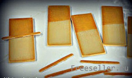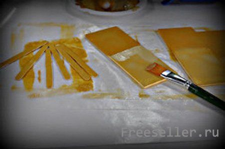 1) Возьмите шесть деревянных планочек/дощечек и с двух сторон по верхней части пройдитесь по каждой из них акриловой краской цвета античного золота.