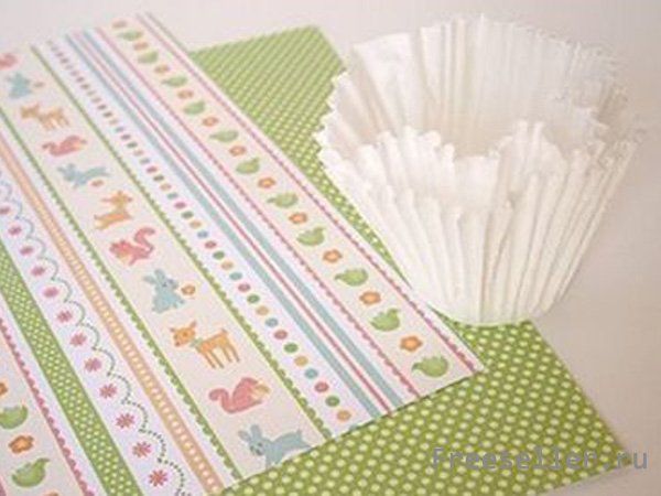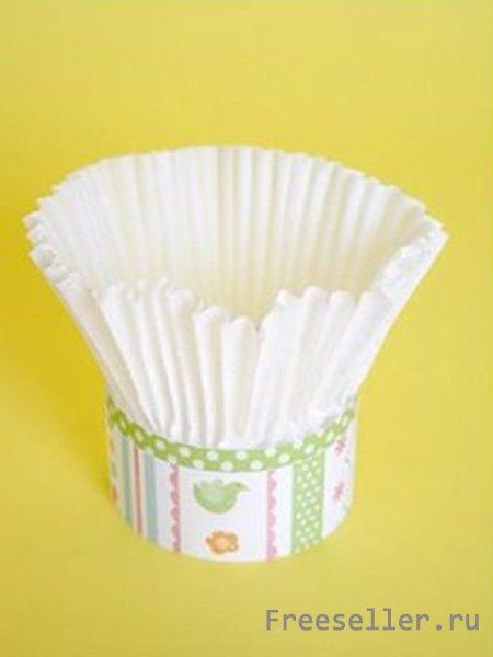 3) Поместите манжетку для кексов большого размера вовнутрь нашего круга из полосочек и приклейте её.