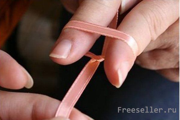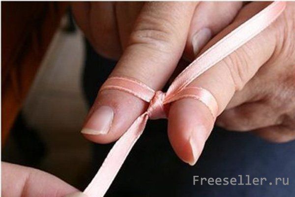 10) Сделайте крест на ленте под пальцами помощника. После сделайте небольшой узелок.