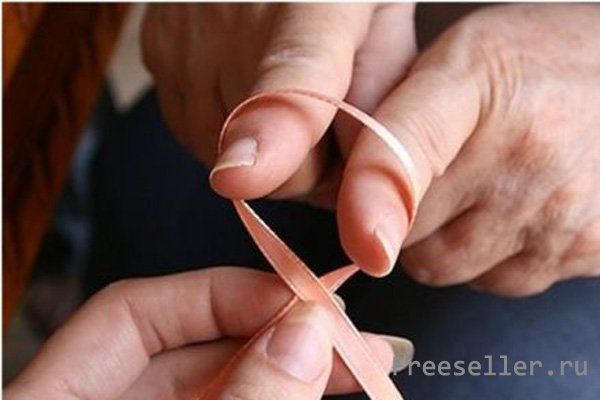 11) Затем обкрутите один из концов ленты вокруг получившегося на пальцах кружка. Обкручивайте её между пальцами вашего ассистента. Завяжите аккуратный узелок и снимите бантик с пальцев ассистента. Если нужно - обрежьте кончики.