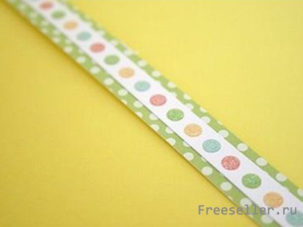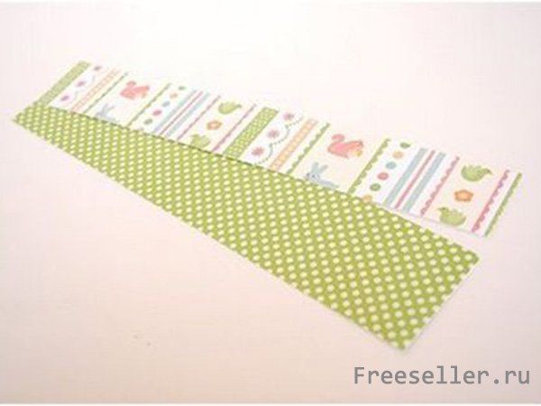 1) Отрежьте полосу узорчатой бумаги около 1 дюйма по ширине. Отрежьте ещё одну полоску контрастной бумаги. Она по ширине должна быть немного больше, чем та, что с узорами.