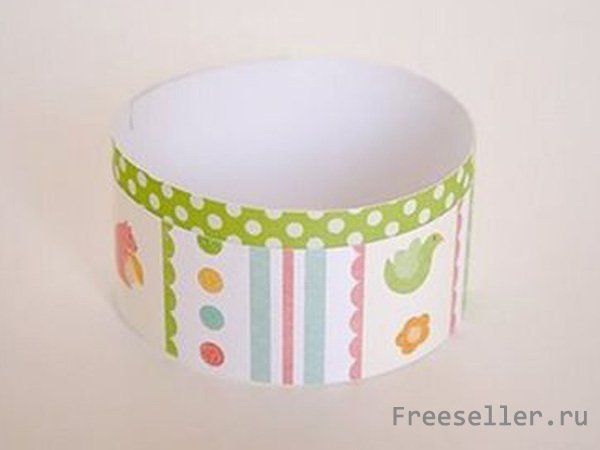 2) Скрутите контрастную бумагу в кружочек и склейте концы по стыку. Узорчатую полоску наклейте поверх предыдущей так, чтобы краюшек контрастной бумаги немного выглядывал. Помните о том, что диаметр такого двойного круга из полосок бумаги должен равняться диаметру манжетки для кексов большого размера.