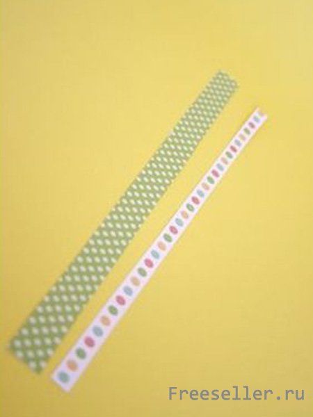 4) Для того, чтобы сделать ручку для корзинки, отрежьте полоску узорчатой бумаги шириной около 1/4 дюйма. Отрежьте ещё одну полочку контрастные бумаги. Но её ширина должна составлять около 25 мм.