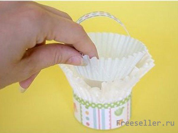 7) Теперь возьмем манжетку для кексов среднего размера и приклейте её к внутренней стороне корзинки. Клейте так, чтобы выпуклости манжетки для кексов среднего размера совпадали с выпуклостями манжетки большого размера.
