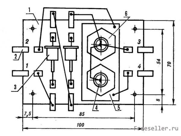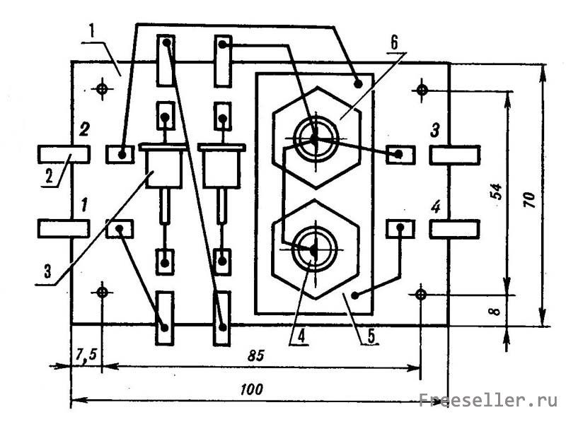 Рис.5. Монтажная схема устройства: 1 - плата, 2 - лепесток, 3 - диод, 4 - конденсатор К50-12, 5 - контактная пластина, 6 - гайка