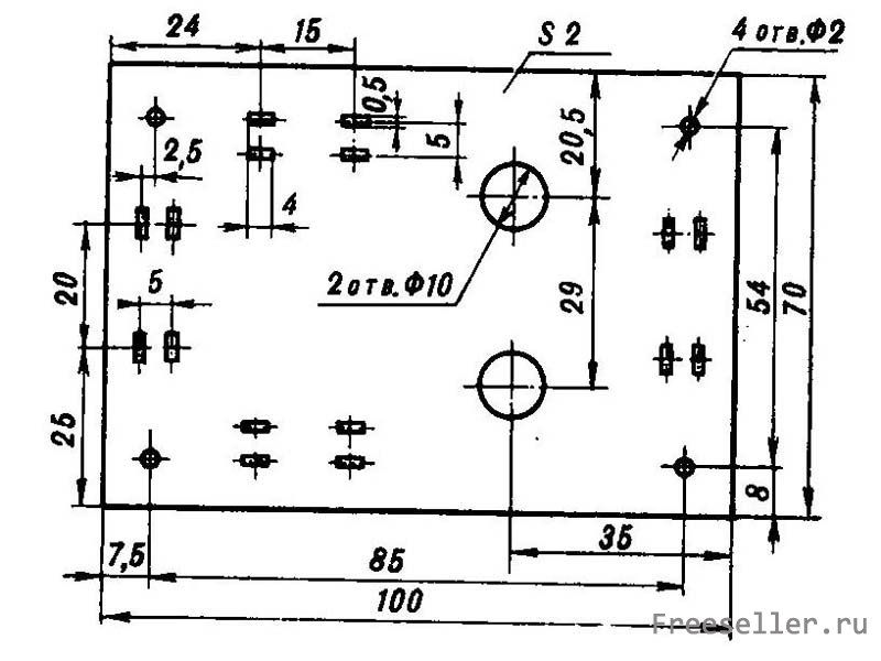 2) Затем сделайте в плате ряд отверстий для установки лепестков и конденсаторов (см рисунок 2). Отверстия можно проколоть по их контурам шилом.
