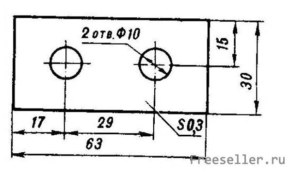 3) Далее из белой жести (подойдет жесть от консервной банки) вырежьте контактную пластину размером 63 х 30 мм и сделайте в ней два отверстия под конденсаторы (см. рис. 3).