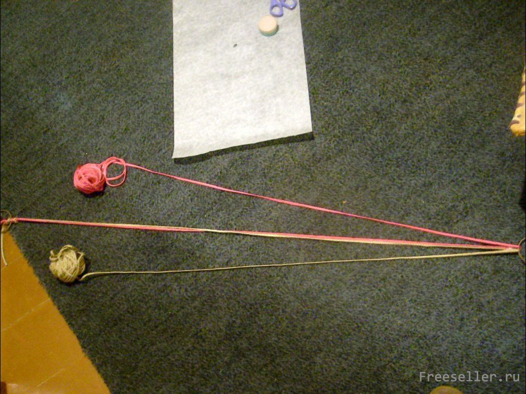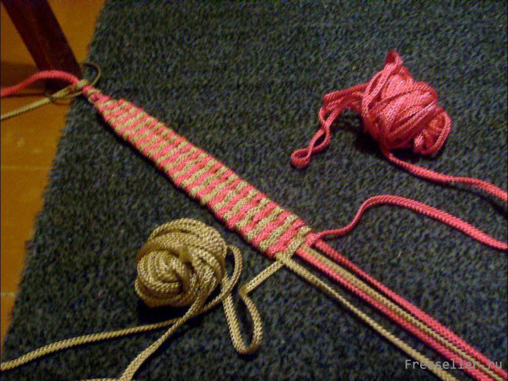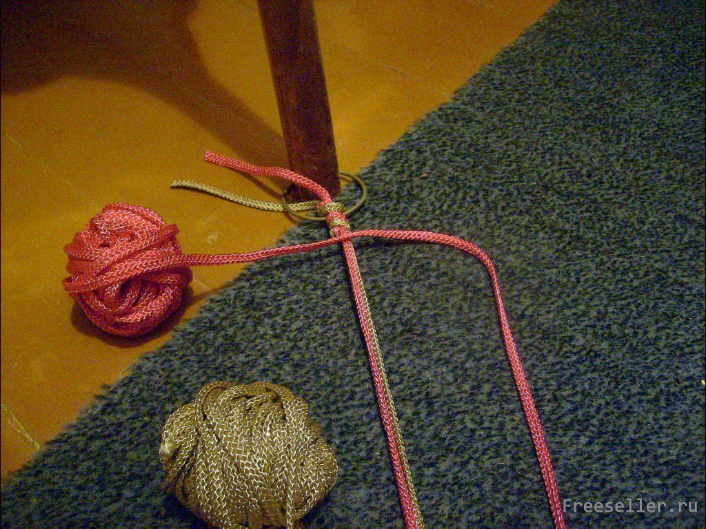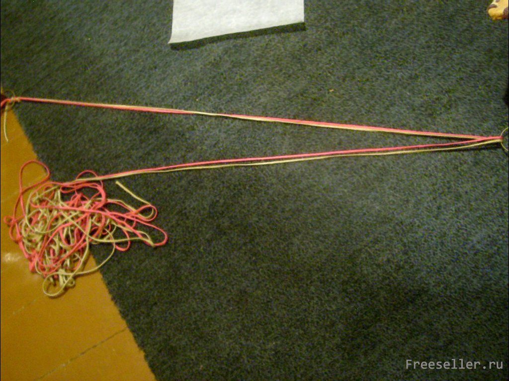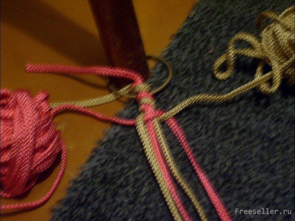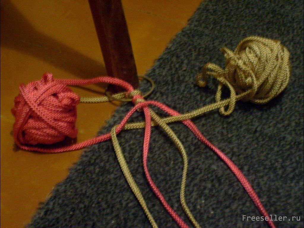 За кольцо крепим концы отрезков шнура обоих цветов к неподвижной точке (у нас для этого служит ножка тяжёлого стула). Натягиваем оба отрезка. Отмеряем длину нашего будущего пояса. Крепим оба шнура к другому кольцу и прочно завязываем. Неподвижно фиксируем второе кольцо с натянутыми отрезками основы. Протягиваем с обеих сторон по длине пояса к началу работы. Всего в основе должны получиться четыре равные натянутые части.