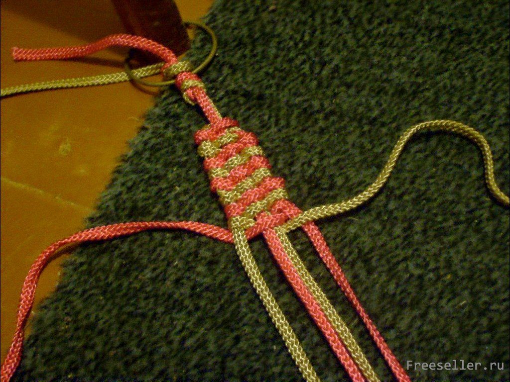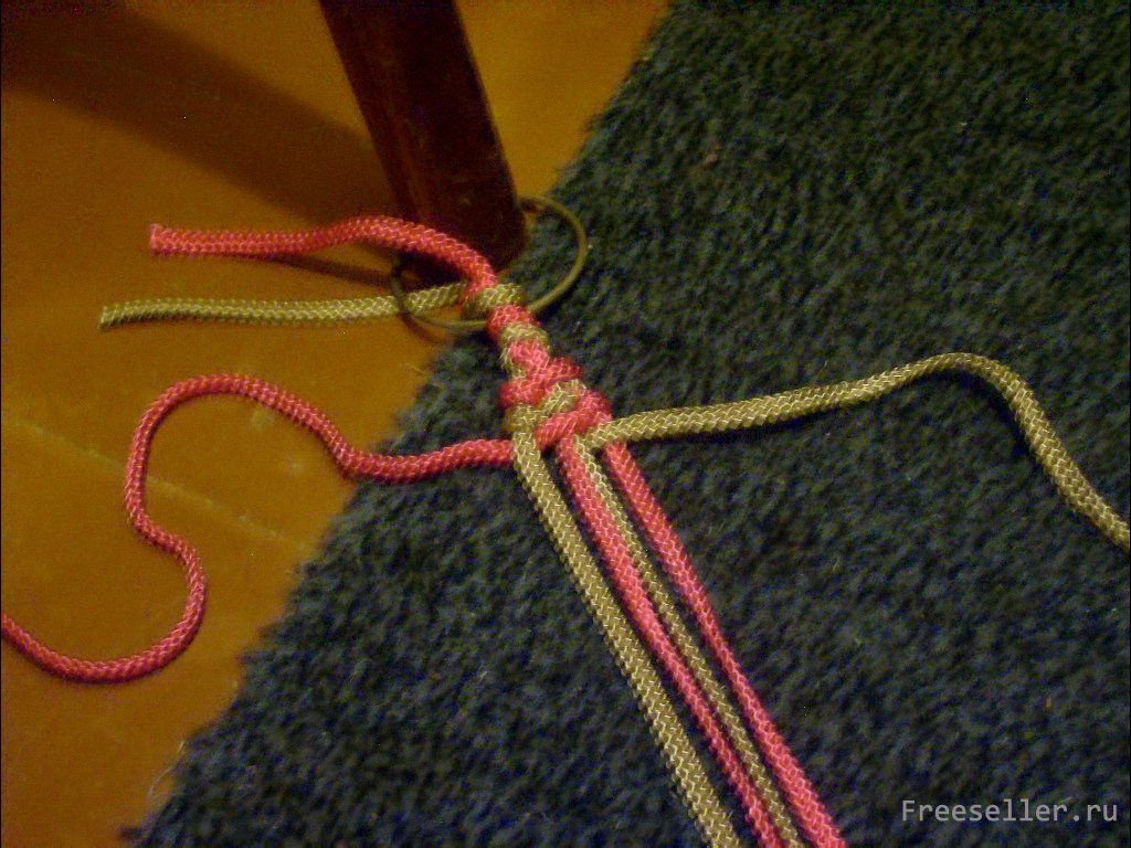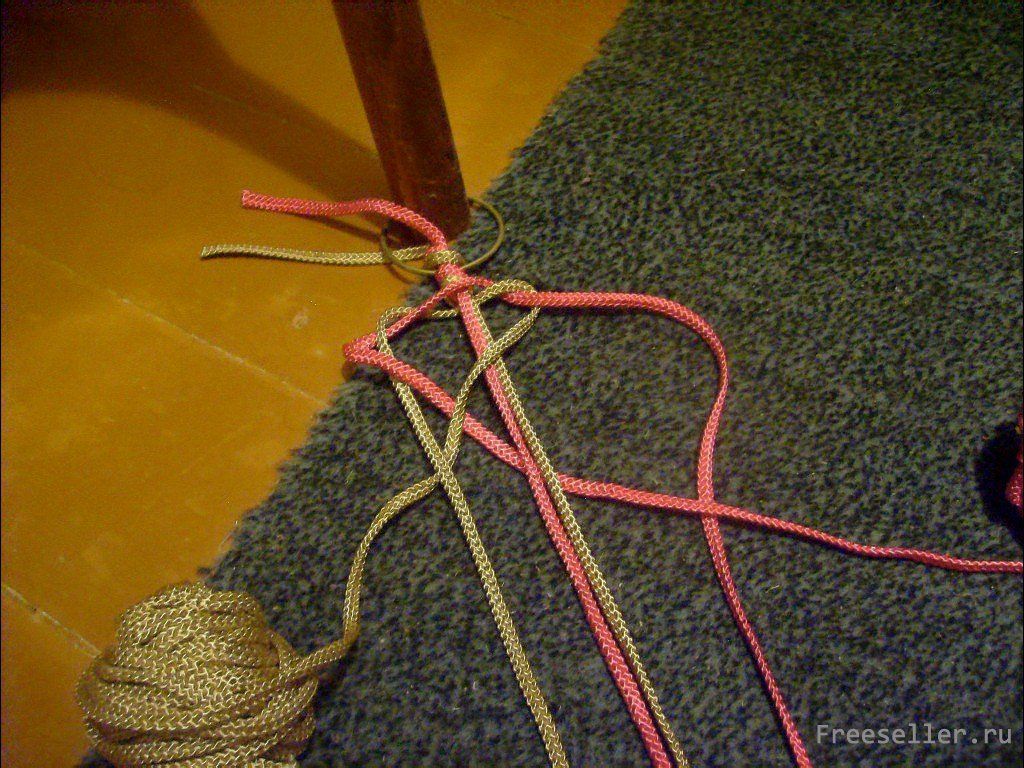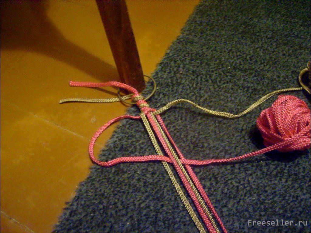 Рабочими будут только крайние фрагменты шнура. Средние служат каркасом. Левый конец шнура поверх левого края работы продеваем под два средних, выводим на лицо, перетягиваем всю его длину направо. Правый конец, выведенный поверх четвёртой (крайней правой) части основы, огибаем вокруг неё, пропускаем над двумя средними и над загнутым левым. Вытягиваем всю его длину на левую сторону под первый, крайний левый шнур основы. Плотно затягиваем узел (не перекашивая основу!), подтягиваем его вверх к самому крепёжному кольцу.