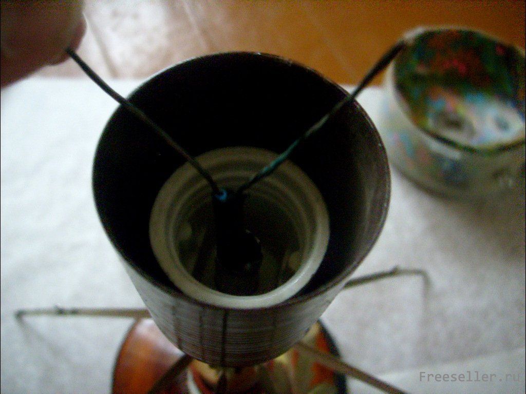 Закрепляем проволоку. Выравниваем спицы. Плотнее насаживаем друг на друга детали конструкции. Надеваем абажур. Осталось вкрутить лампочку, и да будет свет!
