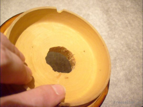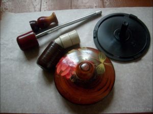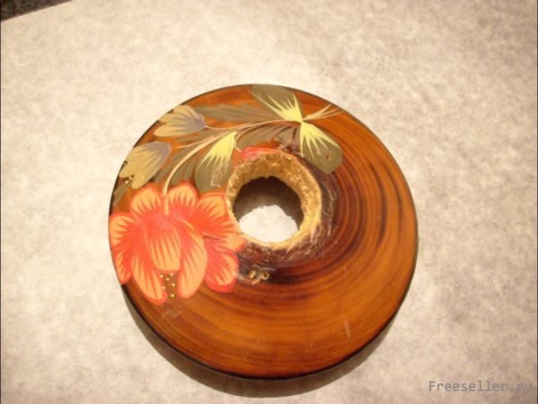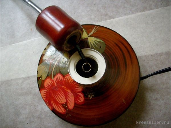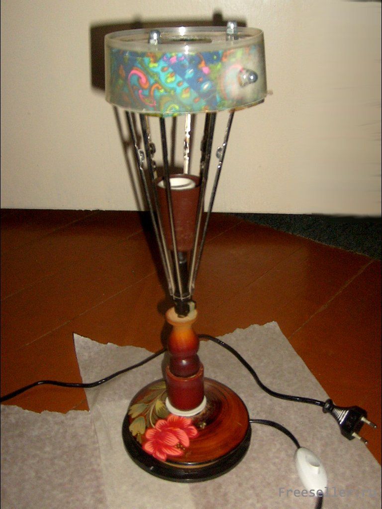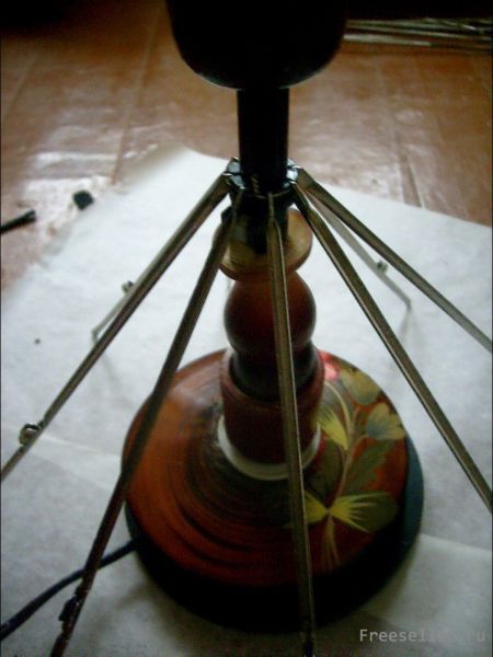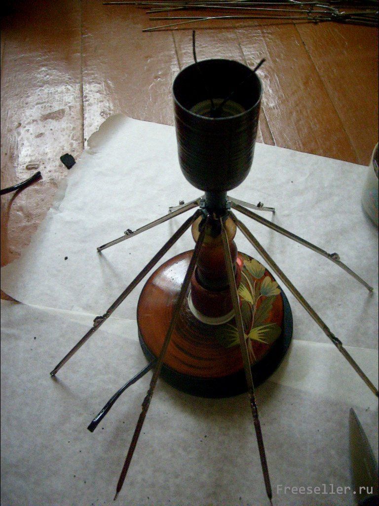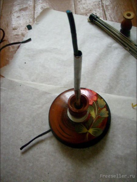 Соединяем, насаживая ручку зонтика рукояткой вниз на заглушку, детали в такой последовательности: пластмассовое дно с заглушкой, деревянная крышка шкатулки, ручка зонтика с отрезком стержня. Её можно и подклеить. Далее на стержень надеваем деревянную фигурную деталь со сквозным отверстием внутри. Не знаю, чем она была, так сказать, в пору активной деятельности, нам она служит просто украшением. Можно обойтись и без неё. Далее надеваем на стержень трубку со спицами от зонтика, а затем "стакан" электрического патрона. Так будет выглядеть наша лампа.