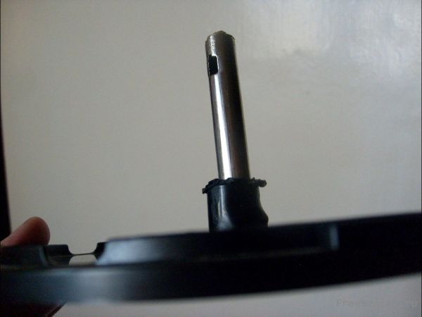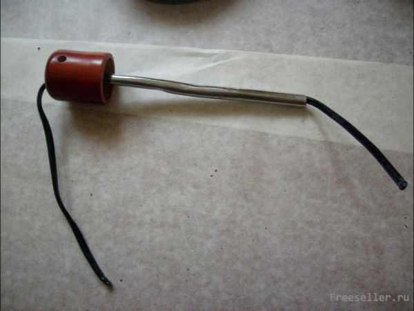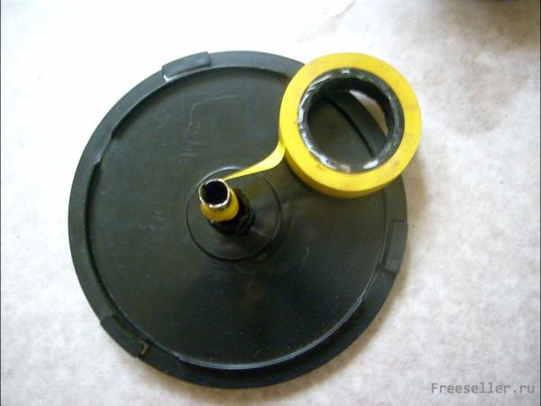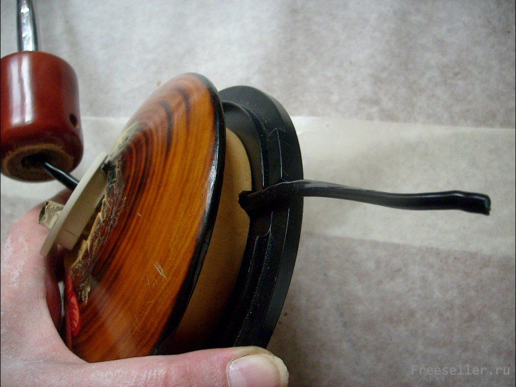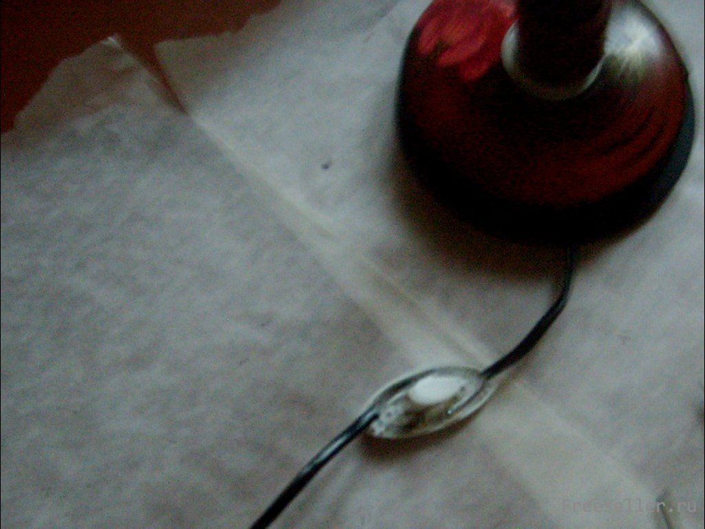 Отпиливаем у крышки шкатулки верхушку. Проделываем в самой крышке достаточно большое отверстие. Сбоку пропиливаем небольшой паз для провода. Раскалённым гвоздём оплавляем штырь пластмассового дна упаковки из-под компакт-дисков. Вставляем снизу верхний конец стержня нашего зонтика. Обматываем его изолентой, чтобы на него плотно села ручка. Расширяем отверстие в ней, подгоняя детали конструкции.