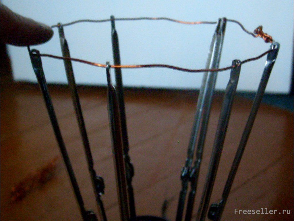 Отрезком проволоки длиной чуть менее диаметра нашего абажура скрепляем по кругу поднятые вверх спицы зонтика.