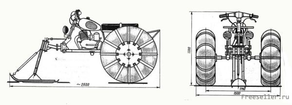 В зимнее время вездеход несложно переоборудовать, для этого необходимо заменить задние колеса на пневматические, а также установить впереди рулевую лыжу. Машина, таким образом, превращается в снегоход, причем на трансформацию требуется менее часа.