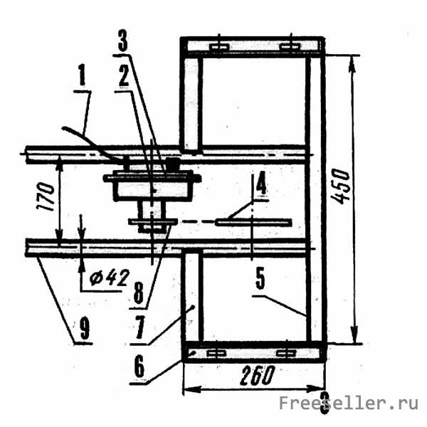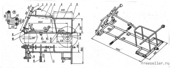 1 - рулевой вал, 2 - рулевая колонка, 3 - топливный бак (от мотоцикла «Минск»), 4- верхняя балка рамы (труба диаметром 22 мм), 5 - разъем (водопроводная муфта с контргайкой), 6 - стойка (труба диаметром 22 мм), 7 - подседельная дуга (труба диаметром 22 мм), 8 - подушка сиденья (от мотоцикла «Минск»), 9 - задняя стойка (труба диаметром 22 мм), 10 - буксирное устройство,11 - звездочка задней оси (z=34), 12 - малая промежуточная звездочка (z=14), 13 - большая промежуточная звездочка (z=38), 14 - моторама (часть рамы мотоцикла «Минск»), 15 - подножка, 16 - узлы крепления переднего моста, 17 - рулевой рычаг, 18 - опорная площадка крепления заднего моста, 19 - разъем (водопроводная муфта с контргайкой), 20 - подшипниковый корпус задней оси.