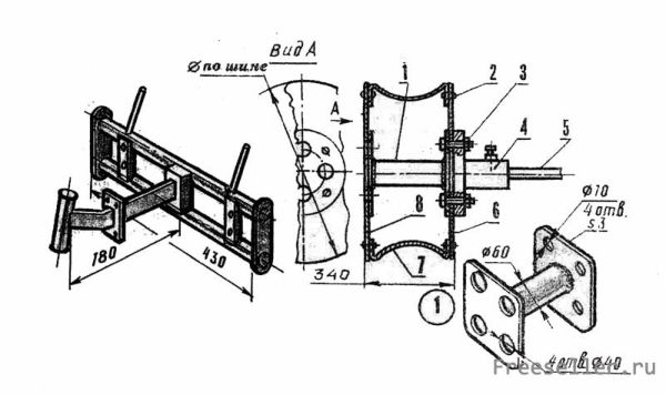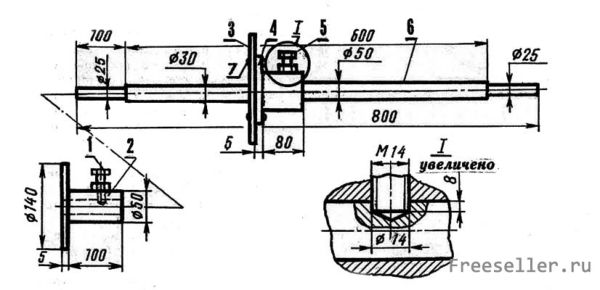 1,5 - стопорные болты М14 с гайками, 2 - ступица, 3 - звездочка (z=34), 4 втулка звездочки заднего моста, 6 вал заднего моста (пруток диаметром 30 мм), 7 - заклепка.