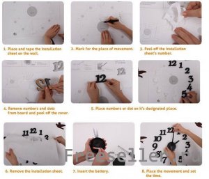 В этом комплекте присутствуют все необходимые цифры для приклеивания на стену, механизм часов, и шаблон для разметки на стене и инструкция хоть и на английском языке.