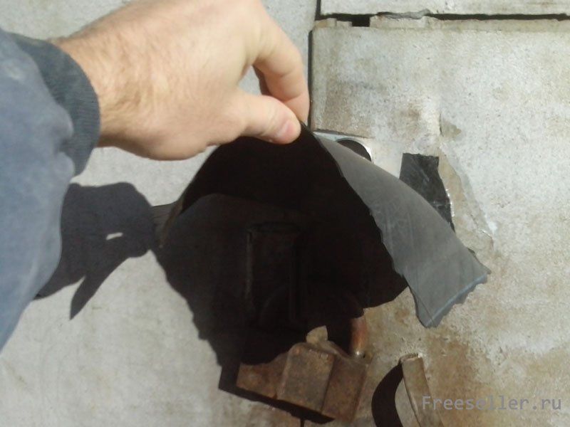 Защиту вырезаем из камеры от грузового автомобиля или куска листовой резины, и просверлив дырку над ушками замка, крепим с помощью болта с гайкой. Незабываем также вырезать прокладку из прочного листового материала (сталь, оргстекло и т.д) чтобы вода не попадала под наш дождевик.