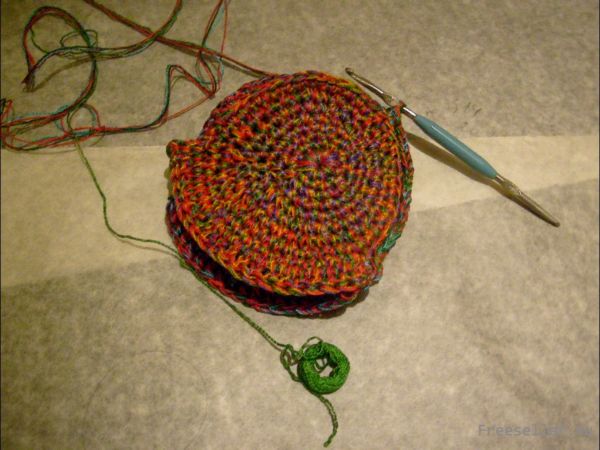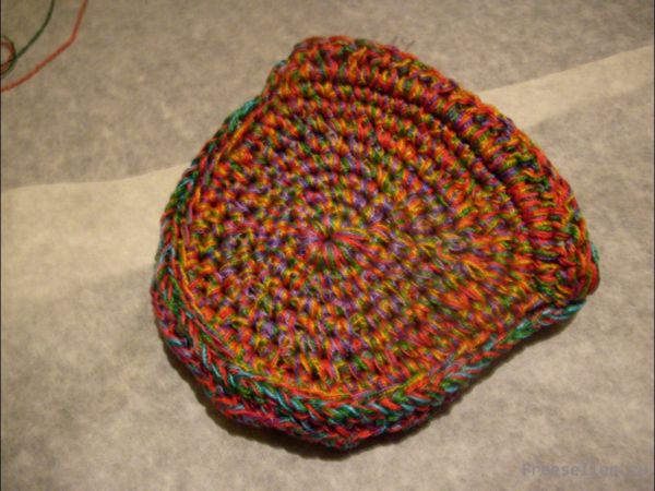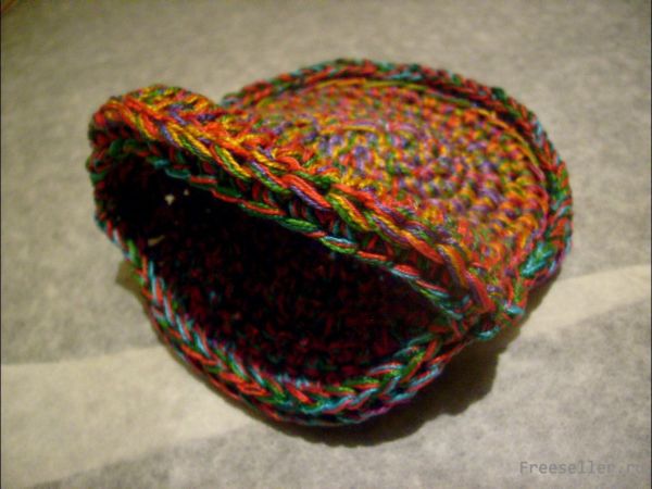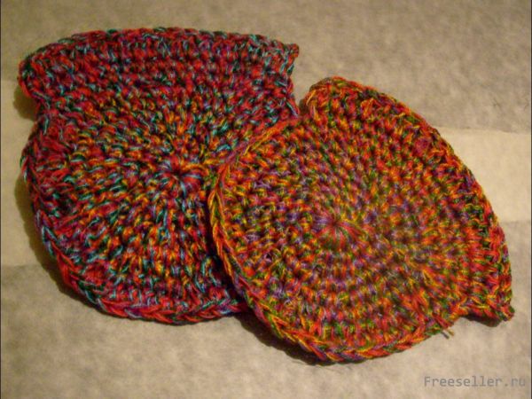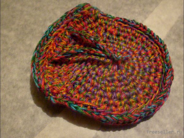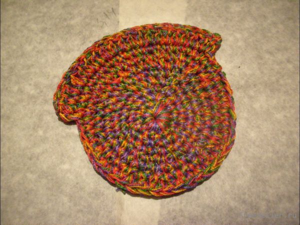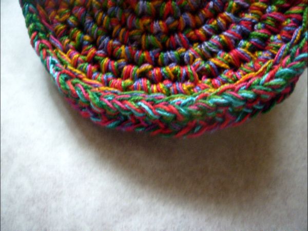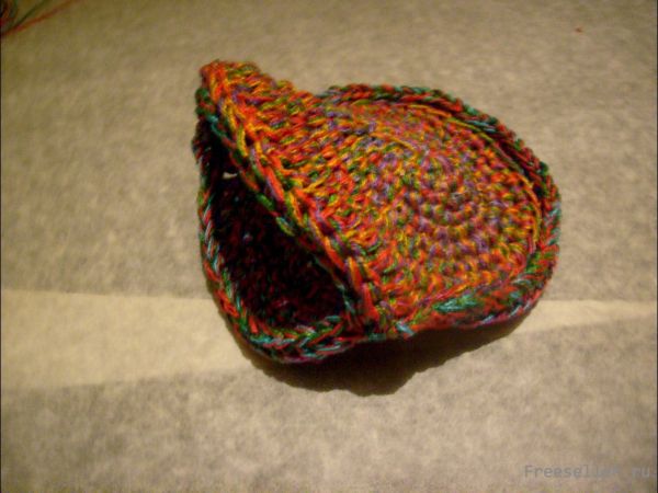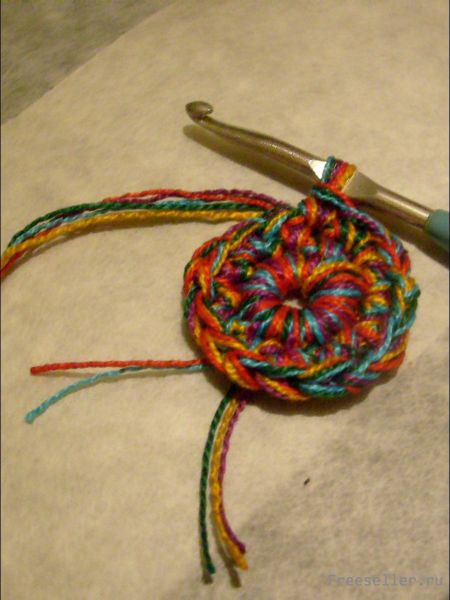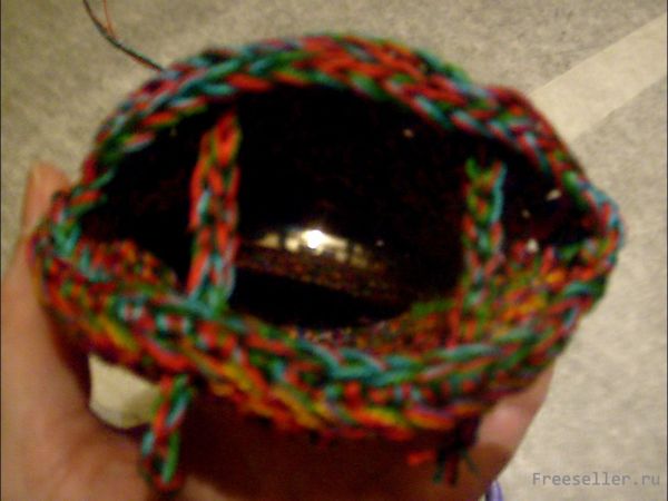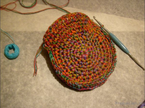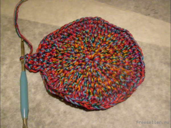 Подбираем яркое сочетание нитей четырёх-пяти цветов. Вяжем крючком цепочку из пяти воздушных петель. Замыкаем её в кольцо. Из его центра вывязываем восемь столбиков без накида. Далее вяжем столбиками без накида по кругу, поднимая вязание воздушными петлями в начале каждого нового ряда. Равномерно добавляем воздушные петли внутри рядов для их расширения. Связав круг достаточной величины, выполняем "горлышко" - провязываем по участку края небольшую оборку (в нашем случае на 20 петлях) столбиками с накидом. Закрепляем рабочую нить узлом, обрезаем её, аккуратно прячем конец.