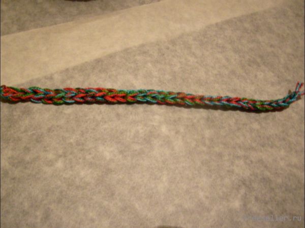 Крючком плетём шнур нужной длины, который послужит нашему футляру застёжкой. Вдеваем его. Связываем концы спереди узлом.