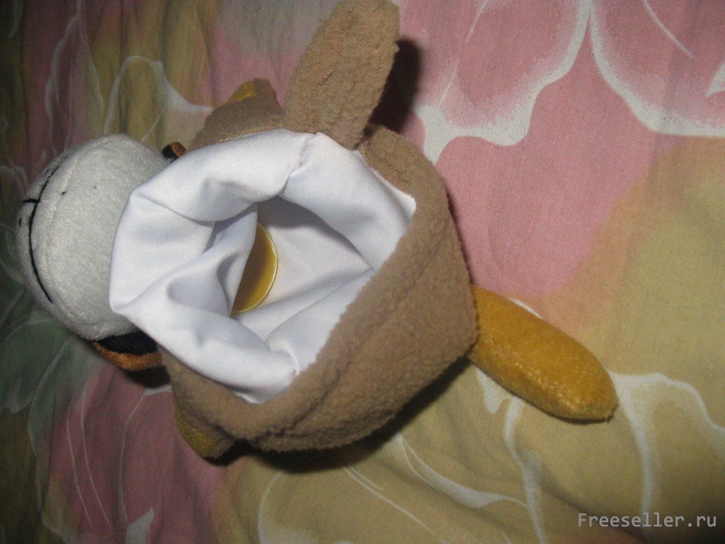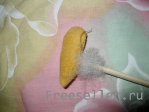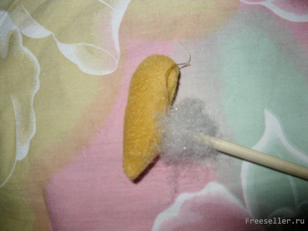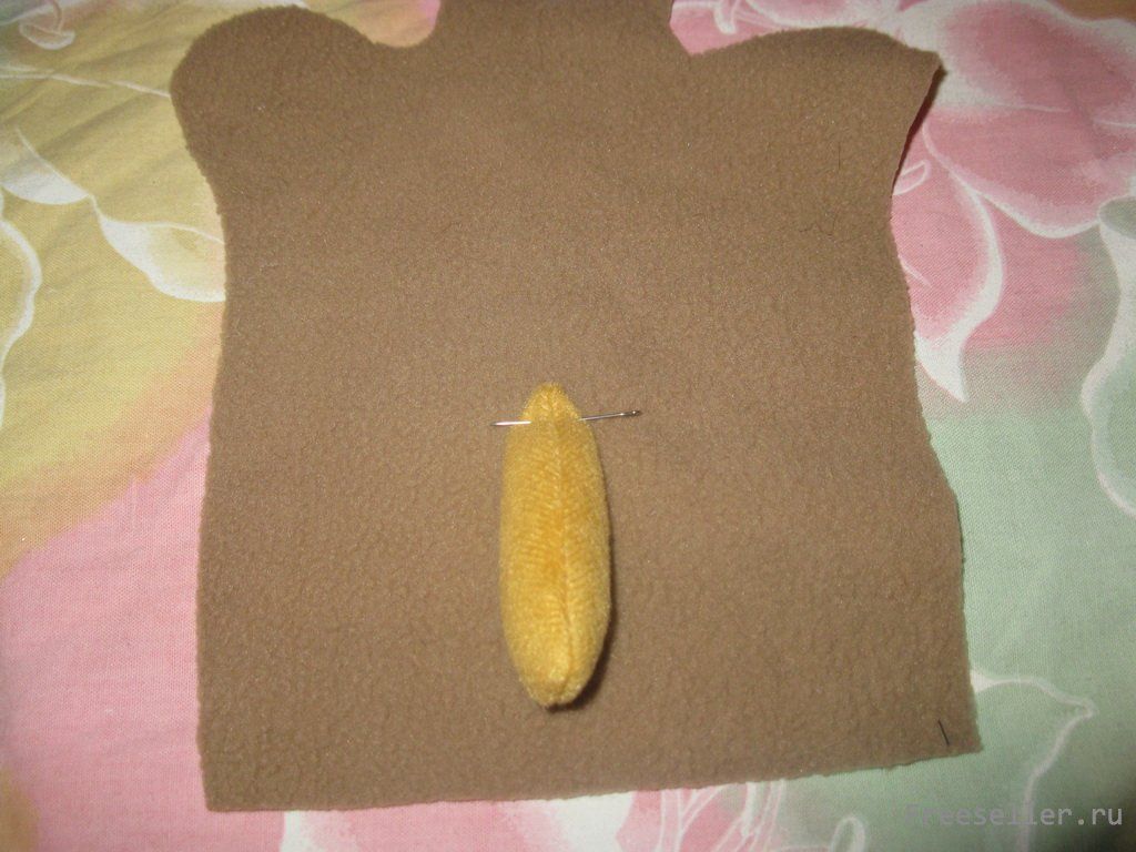 5) выворачиваем туловище, расправляем лапки с помощью карандаша или палочки от суши, с боку внизу туловища прикрепляем заранее подготовленную петлю и, загибая край основной ткани вовнутрь, прострачиваем низ изделия;