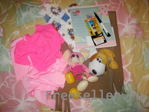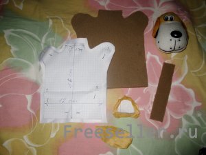 <2) делаем выкройки из ткани: 4 - для туловища (2 из основной, 2 из дополнительной), 2 - для лапок (ткань из кусочков старой игрушки, чтобы туловище сочеталась с головой или лапки выделялись), 2 - для хвоста, 1 - полоска для петли (на ней можно потом повесить игрушку);