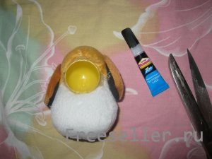 6) берем половинку яйца от киндера и вставляем в " шею" "рукавички-туловища", намазываем ее супер-клеем и насаживаем голову;