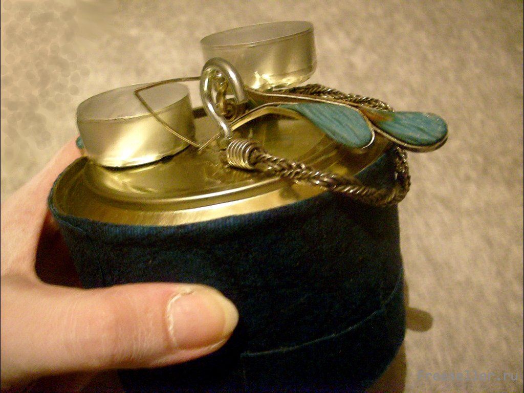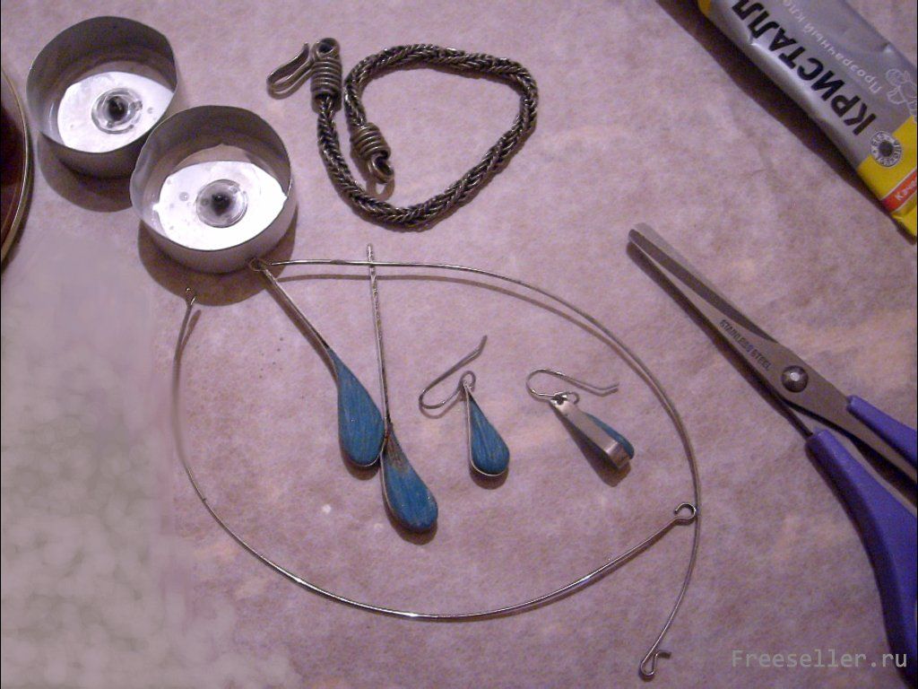 Сняв с серёжек дужки, выгнув (с помощью плоскогубцев) проволоку колье, как задумано, крепим их к поверхности банки.