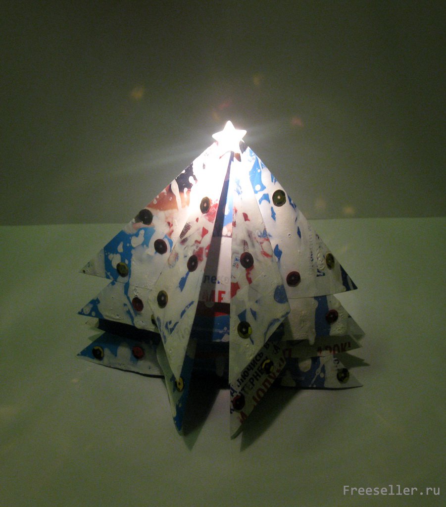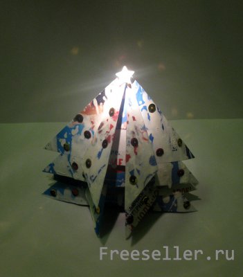 Все, работа готова. А теперь выключаем свет, включаем фонарик, направляем на елку - и она светится огоньками!