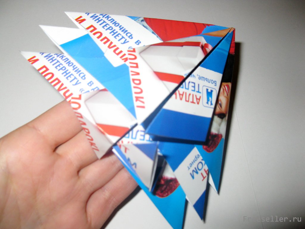 4) теперь левый конец верхнего треугольника накладываем наверх (ребро перпендикулярно основанию треугольника), затем тоже самое проделываем с правым концом;