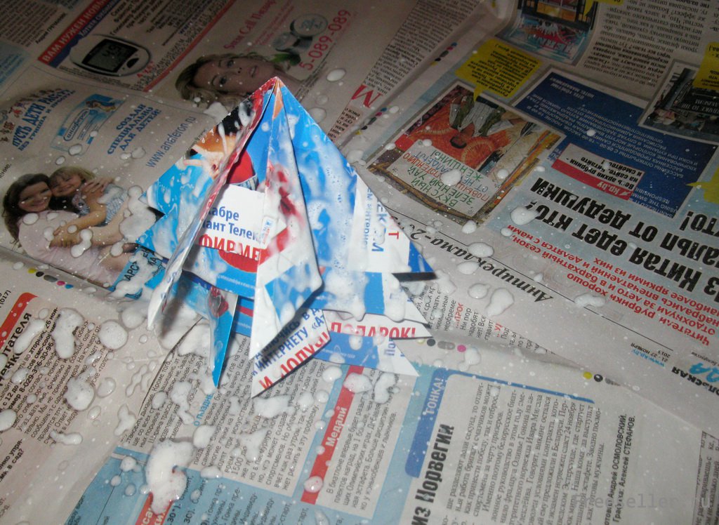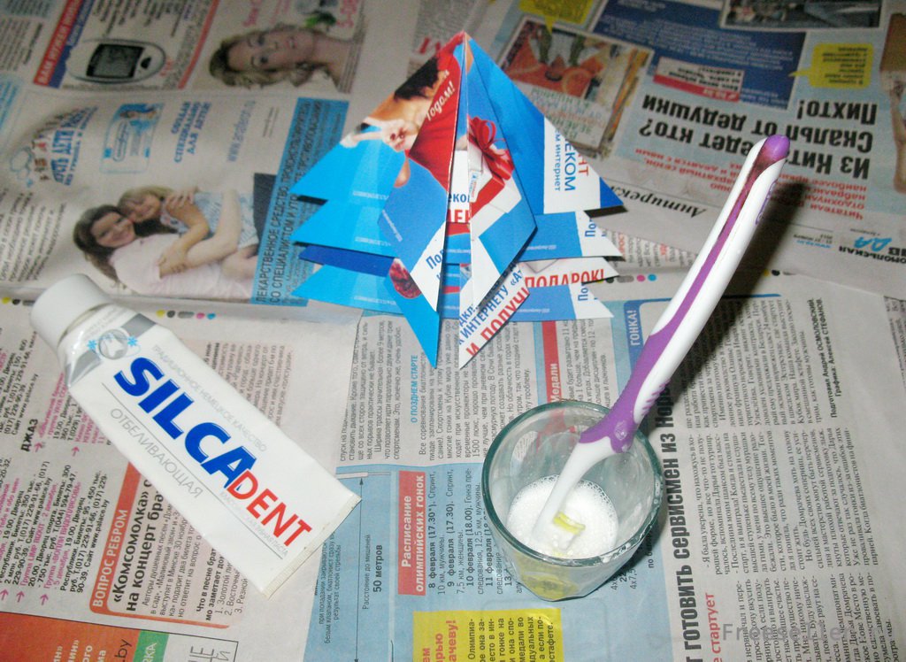 7) когда елка готова, делаем ее припорошенной снегом - для этого разводим зубную пасту водой ("сметанная" консистенция), берем немного полученной массы и разбрызгибаем на елку всеми возможными способами (тут наступает черед по полной оторваться детям! - не забудьте постелить газет);