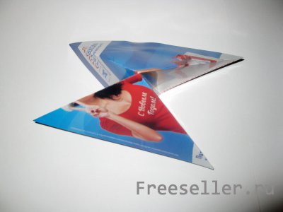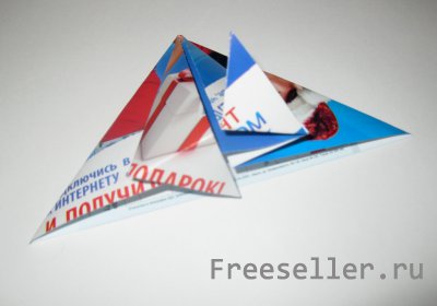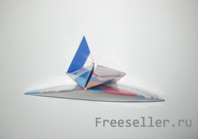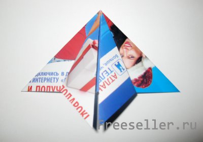 3) разворачиваем полученный треугольник - должен получиться квадрат с диагоналями, собираем его в объемный треугольник таким образом, чтобы боковые (перевернутые треугольники) грани пошли вовнутрь;