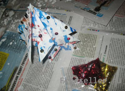 8) даем елочке немного просохнуть и "вешаем украшения" - приклеиваем паетки и перломутровую звездочку наверх.