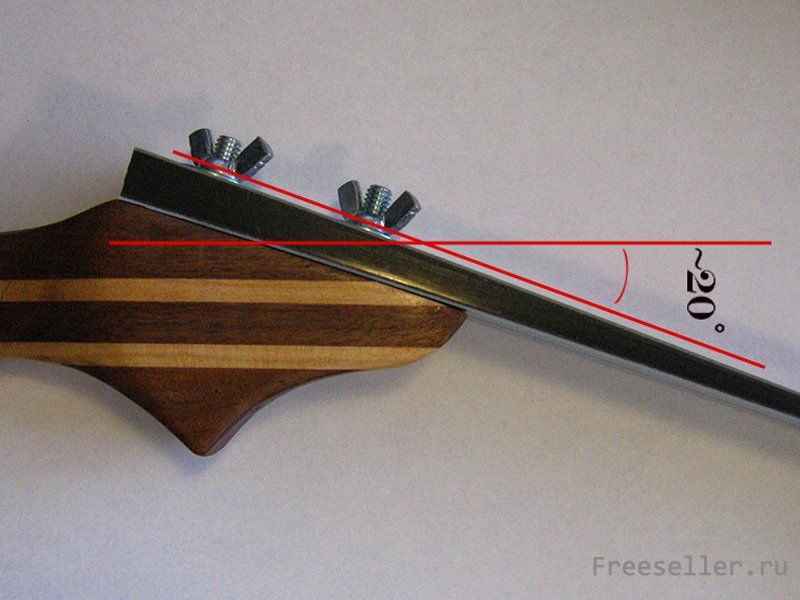 Чем меньше этот угол, тем больше плечо лука будет гнуться при натягивании тетивы, и таким образом, развивать больше энергии. Чтобы не создавать слишком большую нагрузку на лыжи (иначе они могут сломаться), я предпочитаю уменьшать этот угол до 0 ?. Самый простой способ изменить этот угол - вырезать небольшой клин из дерева и просверлить подходящие отверстия. Вставьте клин между плечом и рукоятью и соедините болтом их вместе. Чтобы сделать клин более заметным на фотографии, я обернул его бумагой. Расклинивания плечей увеличивает тягу этого лука с 26 до 30.