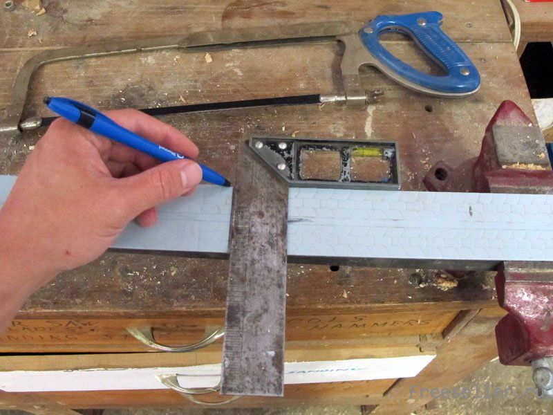 Для 45 см рукояти я отрезал лыжу на длину 55 см (включая ту часть, которая идет внахлест с рукоятью). Плечи были сделаны немного длиннее рукояти для сохранения визуального баланса. Используйте угольник, чтобы провести ровную линию отреза, отрежьте часть лыжи с помощью слесарной ножовки. Не используйте циркулярную пилу или топор для этой операции, особенно если в лыже есть металлическое армирование.