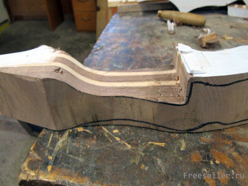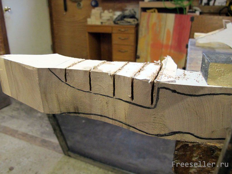 Теперь нужно вырезать полку для прохода стрелы. Поверните заготовку рукояти лука на бок и начертите контур полки. Если у вас есть ленточная пила, процесс вырезания прост - выполняйте те же операции, что и при черновом выпиливании рукояти. Если у вас есть только лобзик (как у меня), то вам может потребоваться стамеска. Большинство лобзиков могут выпиливать в доске до 5 см толщиной. Рукоять, которую я разработал, в положении на боку имеет толщину около 7,5 - 9 см.