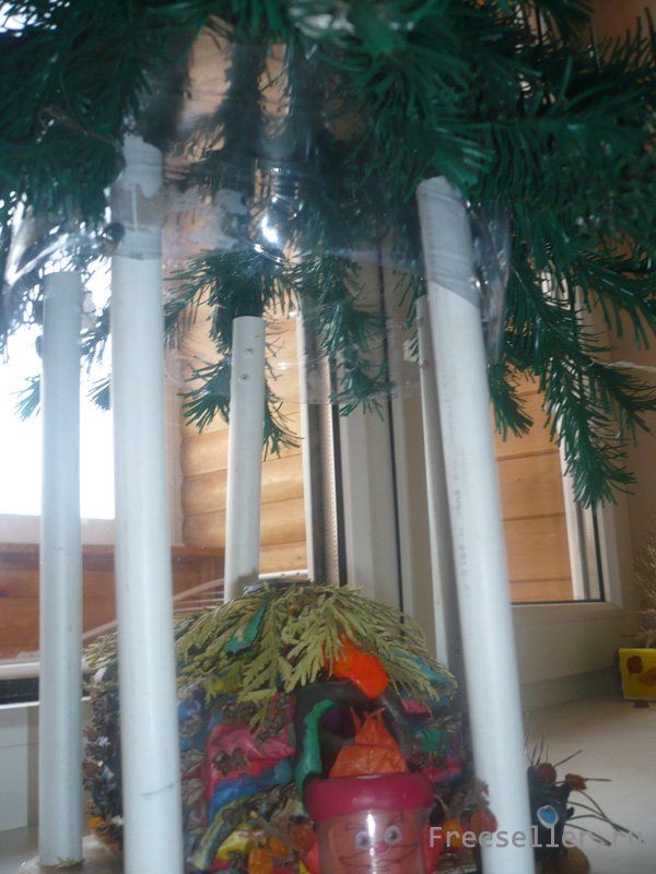Ёлочка очень похожа на избушку на курьих ножках, так как её основа изготовлена из выпиленного круга фанеры, скреплённая 4-мя пластмассовыми трубками, прикреплённые на 8 саморезов, что напоминает курьи ножки. На трубки одета верхняя часть 5-ти литровой канистры, на которую крепится ёлочка.