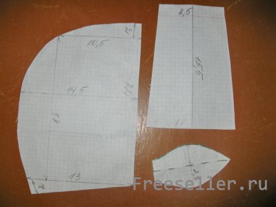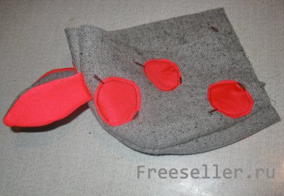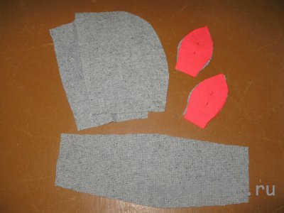 2) когда 3 части шаблона готовы, размещаем их на ткани и делаем выкройку: складываем ткань пополам и вырезаем 2 части - боковых половинок, 1 - середину, 4 (2 и 2) - из драпа и лайкры ушки;