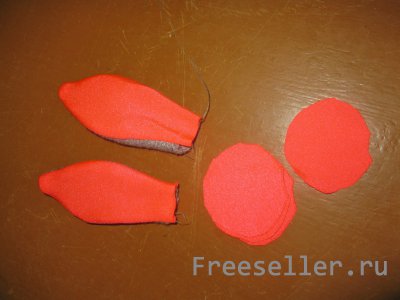 3) сшиваем детали ушек из драпа и лайкры между собой, выворачиваем и вовнутрь вставляем шаблон ушек из картона (чтобы держали форму и стояли торчком); из лайкры вырезаем кружки для "яблок" - будет конь в яблоки :winked: и слегка надрезаем полукруг для сердцевины яблока;