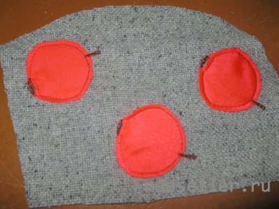 4) настачиваем хаотично "яблочки" и строчкой из коричневых ниток намечаем "сердцевину" и "черенок";