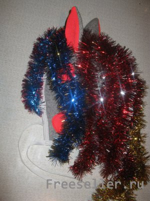 7) делаем "гриву" из мишуры, пришиваем между ушек и по середине шапки.