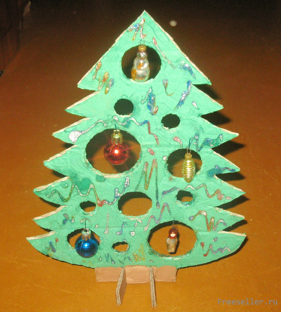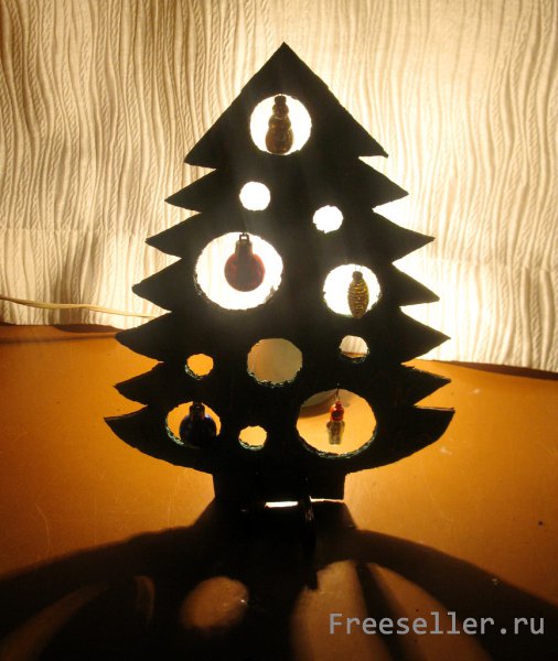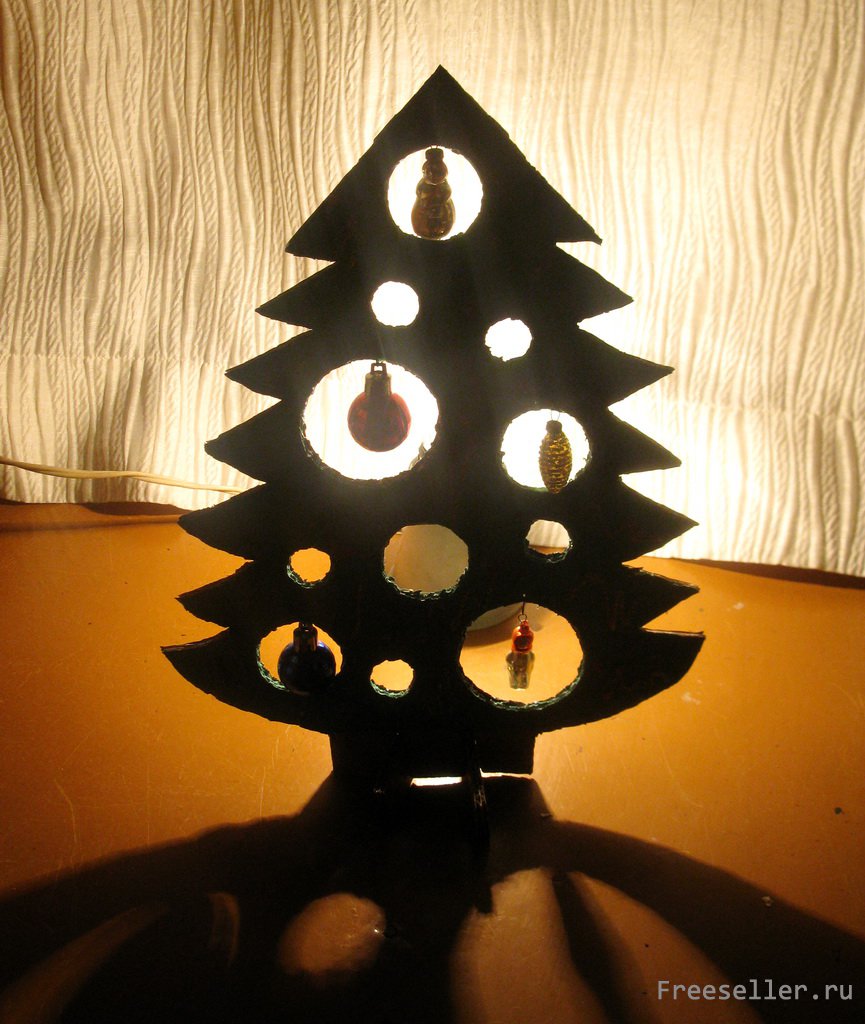 Если вы не собираетесь ставить на праздники живую ель, то можно сделать ее имитацию из гофрированного картона. Он придаст объем, а дырчатое исполнение позволит любоваться елкой с разных сторон. А если поставить ее перед источником света, то получится необычный сказочный силуэт.