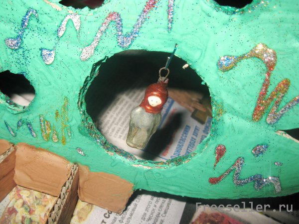 8) берем скрепку и с одной стороны вешаем елочную игрушку, а с другой - цепляем за елку над дыркой, таким образом, чтобы игрушка была видна на просвет.