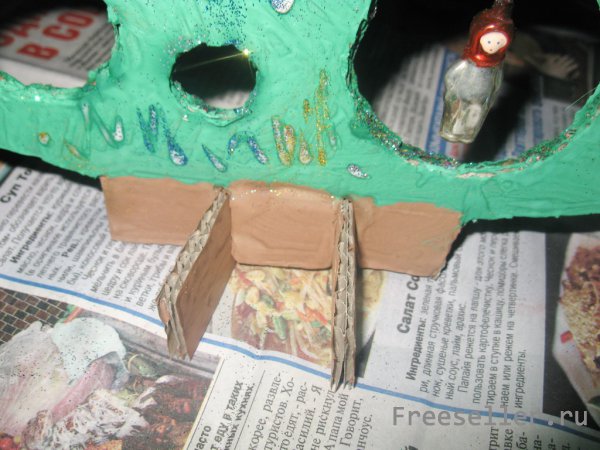 7) ставим елку на "ножку" - для этого в заранее прорезанные щели вставляем две полоски-опоры, прокрашенные в тот же цвет, что и сама "ножка";