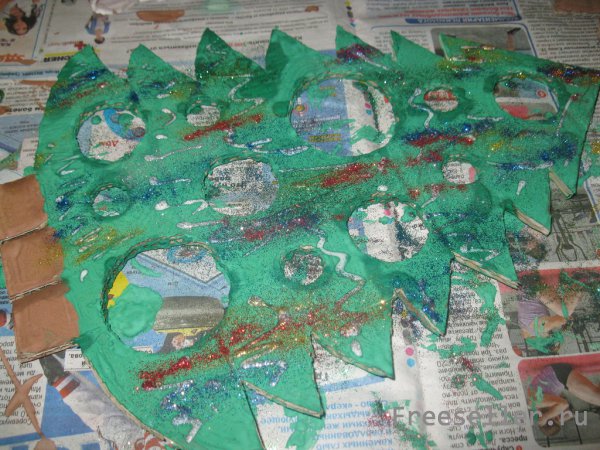5) раскрашиваем елку в традиционные цвета (либо любые другие на ваш вкус и фантазию) - прокрашиваем обе стороны и ребра дырок;